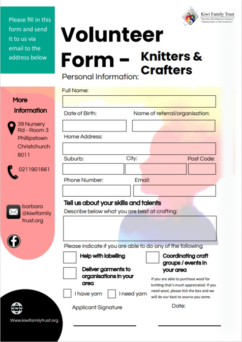 If you enjoy knitting or crafting and you want to get behind a local charity, then look no further. Kiwi Family Trust crafts woolen garments for newborn to 5 year olds around New Zealand. We have many knitting groups situated around the country. Get in touch!
